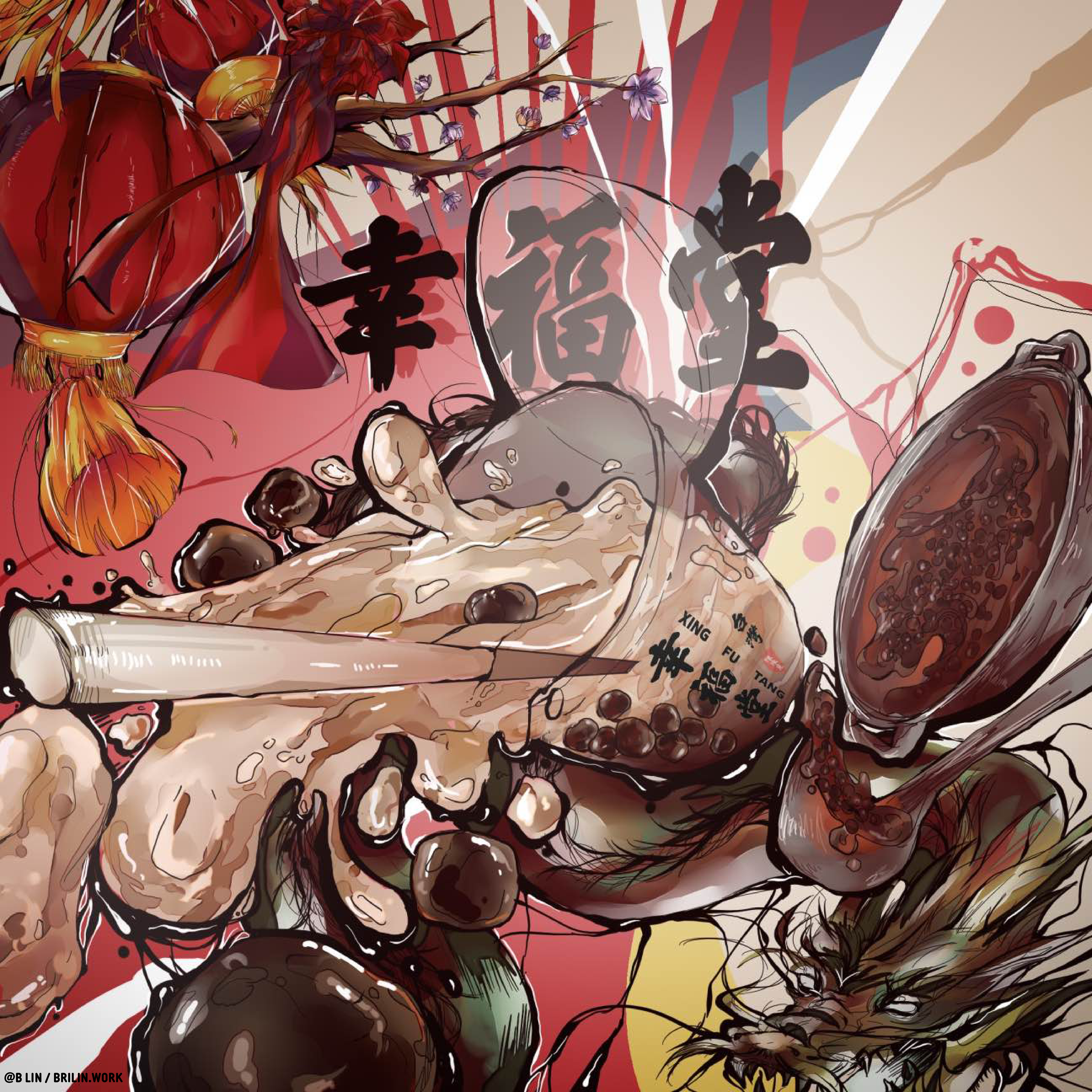 I wanted to focus on the brand's clear Asian heritage. I also wanted to highlight Xin Fu Tang's specialty, which is their brown sugar caramel drinks and handmade wok-stirred boba, as the focal point of the artwork.